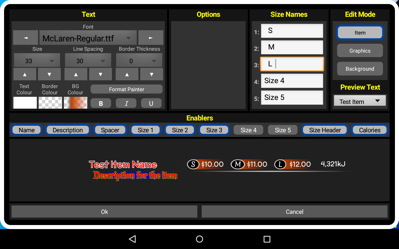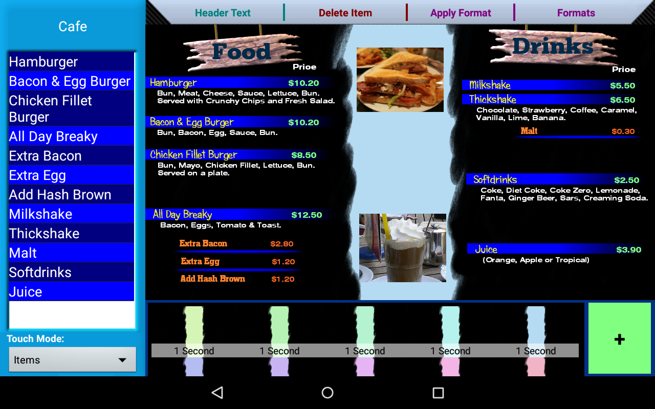 With the touch of a button you can change the Font, Colour & Size of any or all of your products. You can position your products anywhere on the menu you wish by pressing and dragging, you can even add headings for groups of products.